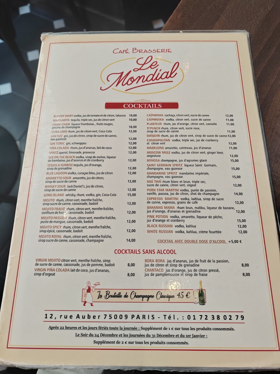 Welcome to Le Mondial, a hidden gem nestled in the heart of Paris at 12 Rue Auber. This charming eatery offers a delightful menu that combines quality ingredients with an inviting atmosphere. Guests rave about the delicious food and friendly service we've come to expect from this establishment.